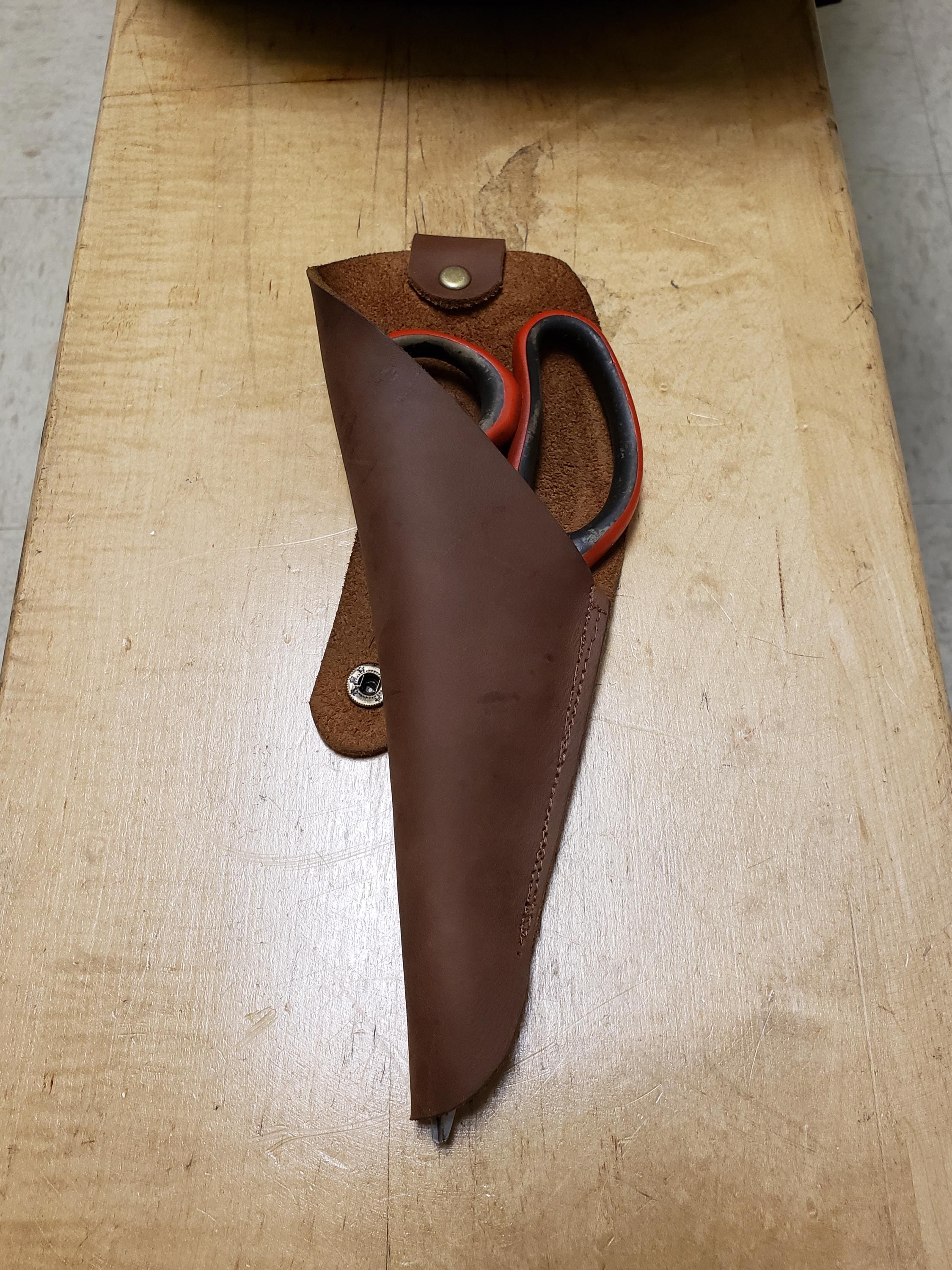 I work at an indie fabric store and keep my own pair of scissors with me. This attached to my smock and holds my scissors perfectly, handy but out of the way until needed.